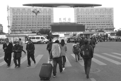 图为3月2日清晨,乘客拉着行李准备进入昆明火车站。 |