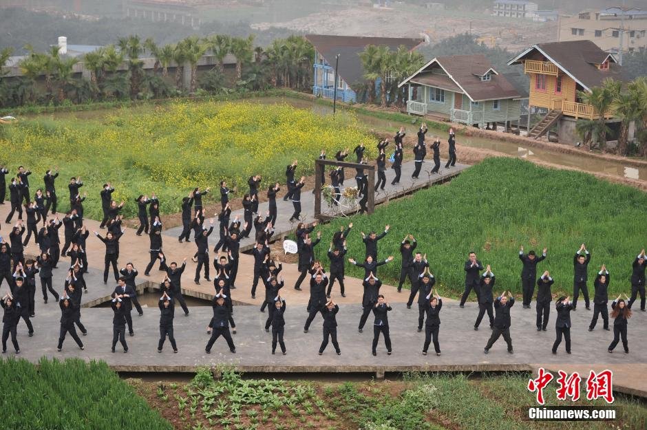3月27日,重庆某集团员工正在工厂楼顶的田野里做广播体操。为增强员工身体素质,提高工作效率,该集团要求员工每天都要做好广播体操,使得员工身心放松。随着集团楼顶“开心农场”的完善,员工们平日在室内做的广播体操搬到工厂楼顶的田野里,让运动融入田野,让呼吸植根于绿色。企业打造绿色生态的办公环境,营造轻松快乐的工作氛围,让企业在践行中国梦的实际行动中践行生态文明和现代企业文明。