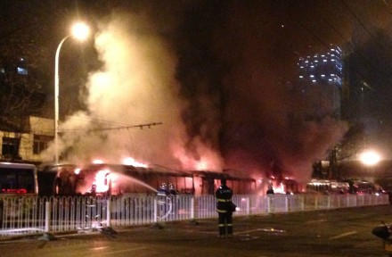 29日夜间,武汉市汉口中山大道有数辆停靠在路边的电动公交车起火燃烧。警方通过视频监控系统追踪,2小时后将2名肇事者抓获,初步判定为是2人企图盗窃电车安全锤所致。 29日晚23时54分,武汉市硚口区公安分局接到110报警,解放大道有数辆停在路边的电车起火。警方立即调集消防官兵赶到现场,及时将大火扑灭。同时调集刑侦、视频侦查等多警种赶到现场开展调查。 警方通过调取现场的视频监控,很快发现起火前有两名可疑人员上车,随即通过城市视频监控系统展开适时追踪,发现两名可疑人员走进了附近一条小路。2小时后,民警将其抓获。 经审查,两名肇事者系本地未成年人,29日晚企图盗窃电车上的安全锤,用打火机烧安全锤的约束带时,引起车辆内饰着火。 目前,案件造成5辆电车被烧毁,一辆小轿车受损,未造成人员伤亡,相关情况正在进一步审查中。 另据《楚天都市报》报道:昨日深夜,在硚口区中山大道硚口路口的2路电车停靠点,5辆电车起火烧毁。目前,事故原因还在调查中。 事发时间在昨晚11时40分左右。目击者张女士介绍,她开窗时,发现楼下有很强的火光,细看发现是电车着火了。只见一辆电车起火后,火势很快向前后左右蔓延,一共有5辆电车先后着火,期间还掺杂着“砰砰”的爆炸声,她赶紧报警。零时许,附近两个消防中队的30多名官兵,及10辆消防车赶到,立即开始紧急扑救,20多分钟后,大火被扑灭。 0时30分许,本报记者现场看到,事发地并排停了30多辆电车,都停靠在路边。交警、消防官兵、电车公司工作人员都还在现场,现场还拉起了警戒线。附近居民称,着火后浓烟非常大,气味刺鼻。 记者发现,一辆黑色雪佛兰轿车因停在失火电车附近,保险杠和车灯受损。 据现场电车公司工作人员介绍,2路电车的行车路线是由硚口码头开往解放大道二七路,每天清晨6时营运至晚10时30分许,11时30分许,会对电车进行断电。当夜有多名值班人员在现场照看,起火后,大家都参与了灭火,但因为火势太大,蔓延迅速,只得看着5辆车被烧毁。其称,每辆电车价值六七十万元,这次损失大约三四百万元。 据微博@平安武汉: 3月29日晚23时54分, 武汉市硚口区公安分局接到110报警,中山大道有数辆停在路边的电车起火。接警后,警方立即调集消防防官兵及时将大火扑灭。同时,刑侦、视频侦查等多警种赶到现场开展调查, 通过调取现场的祝频监控,很快发现,起火前有两名可疑人员上车。警方立即通过城市视频监控系统展开适时追踪,发现两名可疑人员走进了附近一条路, 2小时后,民警将其抓获。 经审查,两名肇事者系本地未成年人,29 日晚企图盗窃电车上的安全锤,用打火机烧安全锤的约束带时,引起车辆内饰着火。 案件造成5辆电车被烧毁,一辆小轿车受损,未造成人员伤亡。目前,相关情况正在进一步审理中。 武汉两名少年为盗安全锤引燃5辆公交车 中新网武汉3月30日电 (杨槐柳 徐金波)29日夜间,武汉市汉口中山大道有数辆停靠在路边的电动公交车起火燃烧。警方通过视频监控系统追踪,2小时后将2名肇事者抓获,初步判定为是2人企图盗窃电车安全锤所致。 29日晚23时54分,武汉市硚口区公安分局接到110报警,解放大道有数辆停在路边的电车起火。警方立即调集消防官兵赶到现场,及时将大火扑灭。同时调集刑侦、视频侦查等多警种赶到现场开展调查。 警方通过调取现场的视频监控,很快发现起火前有两名可疑人员上车,随即通过城市视频监控系统展开适时追踪,发现两名可疑人员走进了附近一条小路。2小时后,民警将其抓获。 经审查,两名肇事者系本地未成年人,29日晚企图盗窃电车上的安全锤,用打火机烧安全锤的约束带时,引起车辆内饰着火。 目前,案件造成5辆电车被烧毁,一辆小轿车受损,未造成人员伤亡,相关情况正在进一步审查中。 |