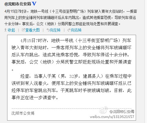 据辽宁省沈阳市公安局官方微博“沈阳市公安局”消息,4月15日7时许,地铁一号线(十三号街至黎明广场)列车驶入青年大街站时,一乘客用列车上的安全锤将列车玻璃砸坏后从车内跳出,造成其他乘客恐慌,导致列车停运十余分钟。事发后,公交(地铁)分局民警立即赶赴现场处置和开展调查。