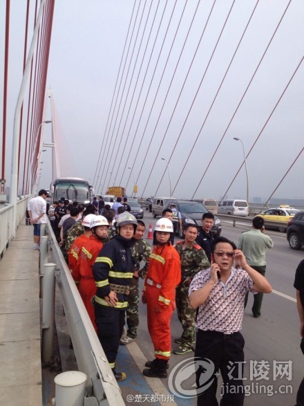 昨日下午2时,湖北公路客运(集团)武汉金地汽车客运有限公司的一辆车牌号为鄂AF1121的长途客车,从武昌宏基客运站出发,开往仙桃。因为绕行带客,下午2时30分许,大客车行至白沙洲大桥桥面上,坐在车厢靠前位置的一名中年男子突然起身,走到司机身后,用一把水果刀架在司机脖子上,大喊“停车”,又转身向满车乘客吼叫,威胁“谁都不准动”。 车上另有34名乘客和一名乘务员。司机停车后,该男子要客车乘务员打电话报警。随后,他对司乘人员说:“我不想伤害你们,我只想与武汉市公安局局长对话。” 下午2时38分,武汉市公安局110报警台接到报警,当即启动突发事件处置预案,并向省公安厅报告。新上任的武汉市委常委、市公安局党委书记喻春祥坐镇指挥,市公安局副局长刘菊生、熊波立即赶往现场。汉阳、武昌两地民警和驻区特警、交警已从南北两岸向白沙洲大桥疾驰。下午2时40分许,市公安局指挥中心急令水警出动,40分钟后巡逻艇抵达指定水域,划出一块警戒水域,注视桥面上一举一动。 劫持事件演变为跳桥秀 最先赶到的是汉阳区公安分局江堤派出所民警、市局特警支队驻汉阳大队特警和交警。来到长途客车面前,民警看到,这名中年男子仍将水果刀架在司机脖子上。民警安抚其情绪,劝其打开车门,有话好好说。 该男子同意司机打开车门,车内30余名乘客和一名乘务员立即下车,被安全疏散。武汉市公安局副局长刘菊生、熊波也赶到现场,进一步与之谈判,劝其放开司机。该男子突然将刀移开,瞬间跳下客车,翻过护栏,站在护栏外的平台上,作出要跳桥的架势,威胁民警不得靠近。 警方查明嫌犯有吸毒史 警方对该男子的调查迅速展开,很快查明该男子姓丁,今年43岁,仙桃市彭场镇人。丁某在护栏外时蹲时立,与警方僵持。这几个小时内,由于警车、救护车停驻大桥两侧道路,繁忙的白沙洲大桥拥堵不堪。 僵持中,丁某要求见女儿、母亲及前妻。在省公安厅协调下,昨晚7时28分许,仙桃市公安局派员赶到事发现场。8时10分许,谈判专家告诉丁某:“你的前妻已经在赶往武汉的路上,我们保证可以让你见到她,你不要不爱惜自己生命。你这样把桥堵了,今天又是周末,沿线都堵车,也要考虑一下别人。”8时15分许,丁某把刀掏出来扔向桥面,说不坚持了,翻过栏杆爬回桥面,迅速被带上警车。 目前,丁某在汉阳区公安分局接受审查。据警方初步调查,丁某有前科,2008年,曾因纵火被判刑,2012年曾因吸毒被行政拘留,2014年3月因吸毒挟持他人再次被行政拘留。 事后,武汉宏基客运站负责人解释,由于犯罪嫌疑人使用刀具并非管制刀具,而是普通水果刀,因此在例行检查时并未发现。下一步将着手购进金属探测门,加大对客运站内乘客的安检。 记者直击 持枪特警引而未发 昨日下午3时05分,一名读者向本报报料称,一辆大客车行驶至白沙洲大桥上遭人持刀劫持,车上还有一满车的乘客。 3时50分许,记者抵达白沙洲大桥引桥段时,往汉阳方向车辆已出现滞留。几分钟后,记者赶到大桥中间时,看到两辆救护车停在路边待命。救护车前,停着一辆车牌号为鄂AF1121的大客车,车头前站着多名消防战士、持枪特警。 记者走到客车前10米远处,看到一名身穿黑色长裤、浅紫色衬衣的中年男子手持一把刀,架在客车司机的脖子上。副驾驶座上还站着一名男子,车内已无乘客。客车外,2名民警正对着驾驶室窗户喊话。 4时15分,持刀男子情绪出现波动,左手搂着司机的脖子,右手持刀不停挥舞,扬言威胁。并架着司机站起来,带着他向前车门处移动。副驾驶座上的男子,则从车内走了出来。两分钟后,持刀男子让司机站在前车门台阶处,同时要求民警全部离开大客车附近。 4时18分,和几名民警谈话后,持刀男子突然放开司机,从客车上跳下来,几秒钟的功夫翻越了两道护栏,爬到了大桥外。右手叉在腰上,左手抓着栏杆向民警喊话,要求他们不要追赶,否则他将跳江。 4时20分,一名民警将大客车开走,4分钟后,现场拉起警戒线。多名民警伸出手想将悬在桥外的男子拉回,男子不仅不伸手,还要求他们不要靠拢。 司机讲述 空手夺刀手指被划伤 昨晚6时许,记者与被劫持司机李某取得联系,他正在接受汉阳警方的调查。李某心有余悸地回忆,从车站出发,经白沙洲大道上三环线时,除了偶尔有点堵车,一路上并没有什么事情发生。当客车驶上白沙洲大桥桥中间时,坐在他后面的一名壮实男子,突然站起来喊他停车。 当时,李某告诉壮实男子不能停车。突然,男子掏出一把长约30厘米的刀,架在他的脖子上,让他把车停在桥中间。同时,该男子主动要求乘务员报警,表示他要跟公安局长直接通话。 李某说,在男子的持刀威胁下,他将车停下来后,伸出右手准备把刀夺下来,没想到右手一把抓到刀刃上,右手大拇指和食指被划伤鲜血直流。除两根手指受伤外,其他无大碍。 协助谈判 记者劝男子别做傻事 下午4时20分许,持刀男子攀爬至白沙洲大桥护栏外的桥廊上后,现场处置的民警迅速追赶过去,没想到男子却以跳桥相逼,让民警不要过去。民警们只好在离其1米远处,劝他千万别做傻事。 在现场,记者了解到,丁某是仙桃市彭场镇人,他有一个女儿正在读大二,而妻子与他已经离异好几年。因记者恰好与其是同乡,警方特许进入现场对他进行劝慰。 在现场,丁某告诉记者,他与前妻已经七年没有见面了,若是民警能帮他将前妻找来见上一面,他将回