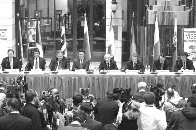 : 2月24日,在匈牙利首都布达佩斯,(从左至右)匈牙利外交部新闻发言人考莱陶、罗马尼亚外长科尔勒采安、希腊外长韦尼泽洛斯、保加利亚外长维格宁、匈牙利外长毛尔托尼、捷克外长扎奥拉莱克、波兰外长西科尔斯基和斯 ...