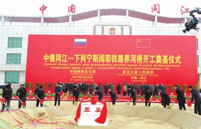 : 2月26日,中俄同江—下列宁斯阔耶铁路界河桥开工奠基,这是两国首座跨界河铁路桥,设计年过货能力2100万吨。中俄同江—下列宁斯阔耶铁路界河桥中国境内线路全长31.62公里,主桥全长2215米(中国境内长1900米),中方 ...