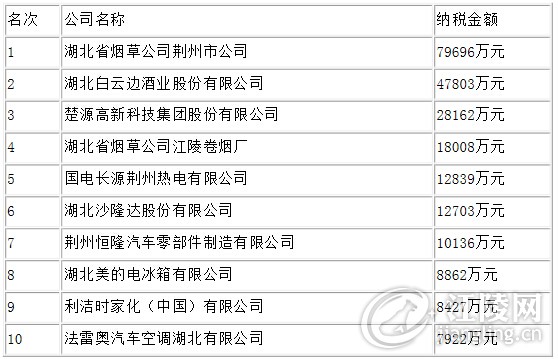 11日,记者从市国税局获悉,2015年荆州国税纳税前十名企业名单出炉。湖北省烟草公司荆州市公司以7.9696亿元居榜首,去年全市纳税亿元以上的企业有7家。 据了解,2015年全市国税纳税前十名的企业分别是:湖北省烟草公司荆州市公司、湖北白云边酒业股份有限公司、楚源高新科技集团股份有限公司、湖北省烟草公司江陵卷烟厂、国电长源荆州热电有限公司、湖北沙隆达股份有限公司、荆州恒隆汽车零部件制造有限公司、湖北美的电冰箱有限公司、利洁时家化(中国)有限公司、法雷奥汽车空调湖北有限公司。 记者了解到,2015年企业纳税千万元以上企业达到79户,入库税收394663万元,占总收入比重达60.2%,比上年提升3.6个百分点。纳税100万元以上企业477户,增加17户,提供了78.4%的国税总收入。规模企业多维度支撑、多层级壮大,进一步增强了税收增长的稳定性和持续性。( 2015年荆州国税纳税前10名企业